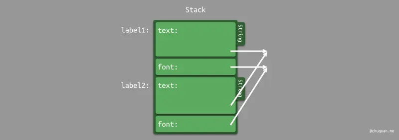 上述 Class 的内存是在堆区分配的,栈区仅仅分配了 point1 和 point2 两个指针。值得注意的是,为了管理对象内存,在堆区初始化时,除了分配属性内存(本例中是 Double 类型的 x, y),还分配了两个字段:type、refCount。其中,type 表示类型,refCount 表示引用计数。