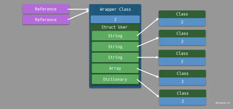 因此,我们应该尽量避免在 Struct 类型中包含引用类型,因为这可能产生大量的引用计数。