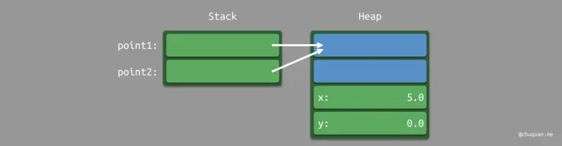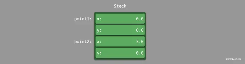 上述 Struct 的内存是在栈区分配的。将 point1 赋值给 point2 会在栈区分配一块内存区域,创建新的实例。两者相互独立,操作互不影响。