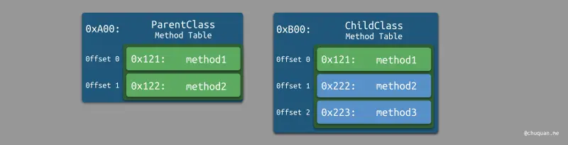 在这个情况下,编译器会为 ParentClass 和 ChildClass 各自创建一个函数表。如下图所示,展示了 ParentClass 和 ChildClass 函数表中各个方法在内存中的布局。