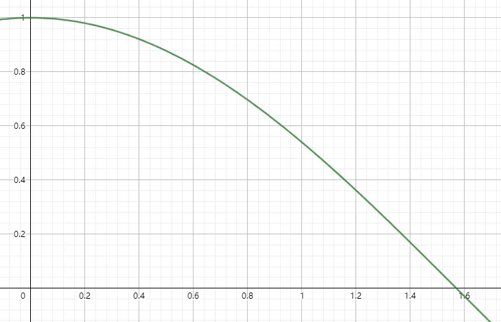 法线方向 和 灯光方向 的 点积 可以描述 漫反射 的强度,而 单位向量的点积 其实就是 向量夹角的cos值,考虑一下下图的 cos曲线: