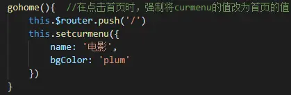 - 点击首页时触发点击事件,通过编程式导航,将路由值改为首页的路由值, 此时颜色并不会因为路由的转变而变为首页的颜色 需要调用setcurmenu方法,并将首页的值传给setcurmenu方法,通过setcurmenu方法将curmenu的值改为首页的值