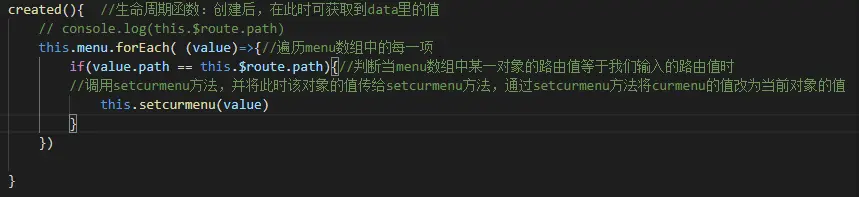 - 由于只有在点击页面入口和点击首页时,会触发setcurmenu方法,而将当前头尾栏的值改变,所以在搜索路由进入页面时,头尾栏的颜色和信息不会做出相应改变,此时需要用到生命周期函数,在创建结束的函数中遍历menu数组中的每一项,判断当menu数组中某一对象的路由值等于我们输入的路由值时,调用setcurmenu方法,并将此时该对象的值传给setcurmenu方法,通过setcurmenu方法将curmenu的值改为当前对象的值