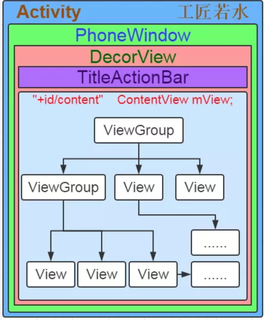 从上面的图可以清楚的看出各个层级的关系,到了DecorView这一层,就是我们最熟悉的View树结构了;