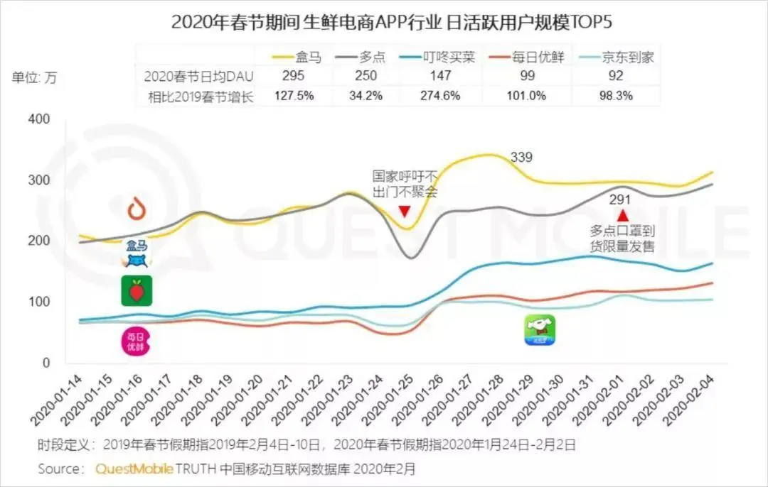 据统计: 盒马鲜生在部分城市线上日销同比去年翻倍;每日优鲜春节销量同比翻3倍;叮咚买菜的客单价由55元提升到了90元;苏宁菜场日销已达节前的6-8倍;美团买菜日均订单量为节前的2-3倍。而微信小程序官方数据显示,2020年除夕到初七,小程序生鲜果蔬业态交易笔数增长149%,社区电商业态交易笔数增长322%。