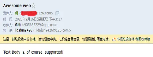 注意,126 的 SMTP 服务器检测比较严格,加上 HTML 之后,很容易被识别为垃圾邮件不让发送,这时 CC 自己就 OK 了。