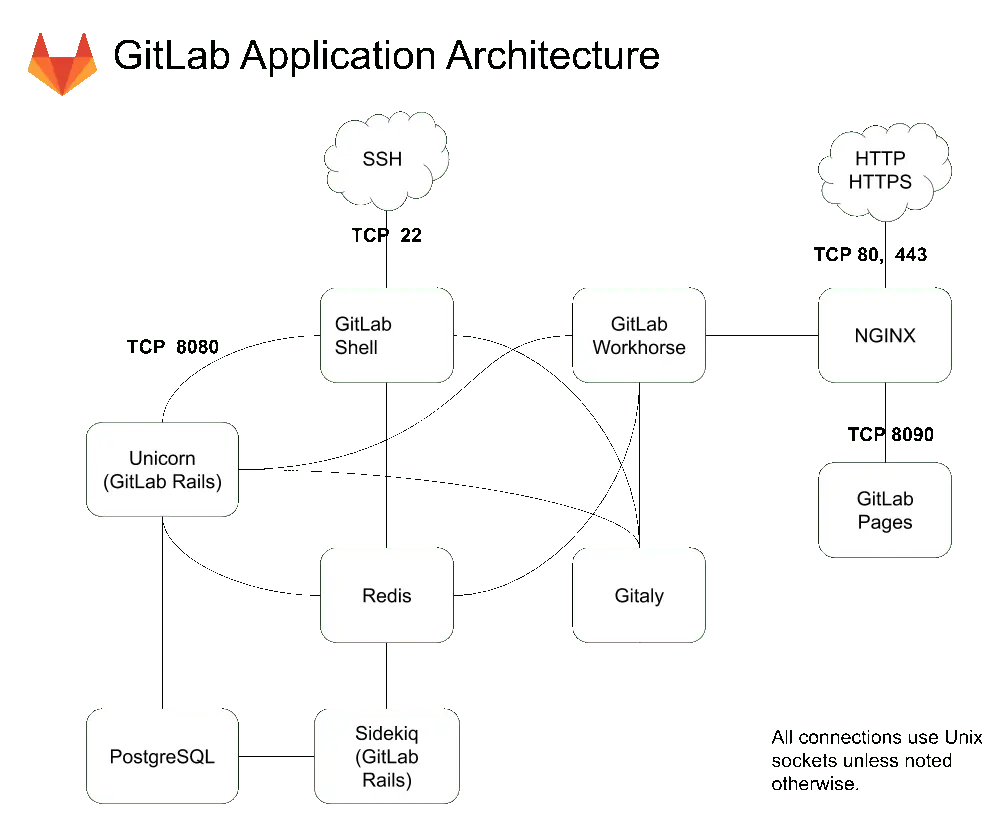 - Unicorn (GitLab Rails): Handles requests for the web interface and API