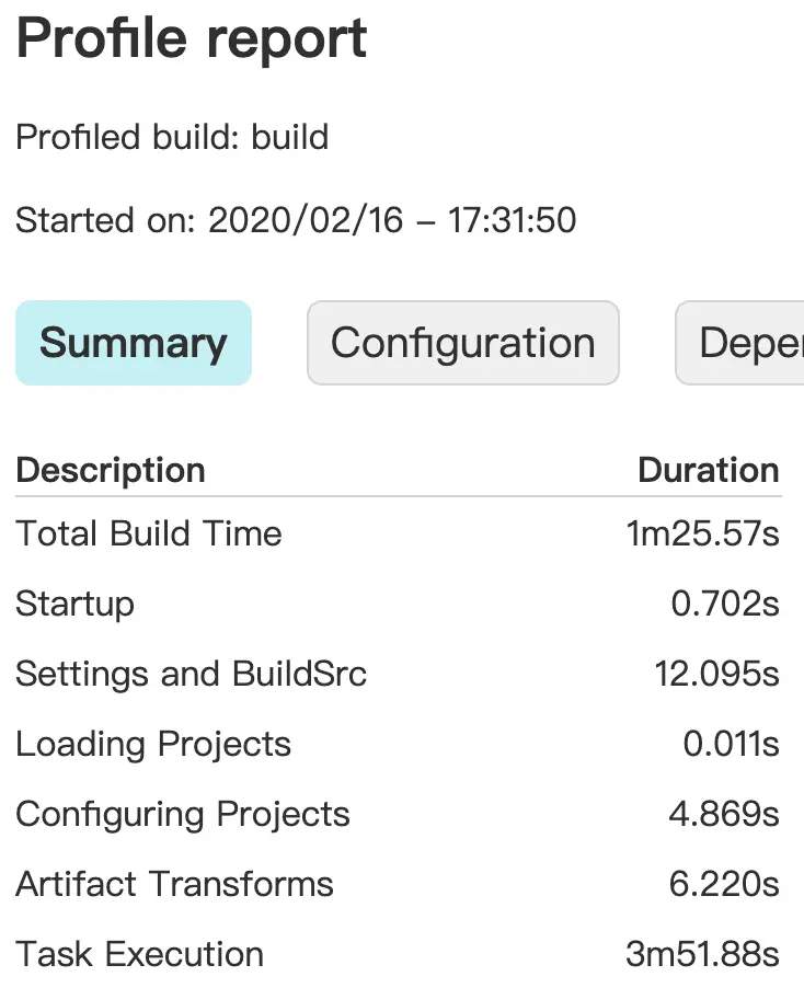 Gradle的插件版本对Gradle的构建速度相差很大,由于Gradle版本升级一直致力于提升构建速度,所以强烈推荐升级Gradle版本,以获取最大限度的构建速度,再经过Gradle的一些配置和减少耗时任务,完全可以在40秒之内构建好一个项目。
