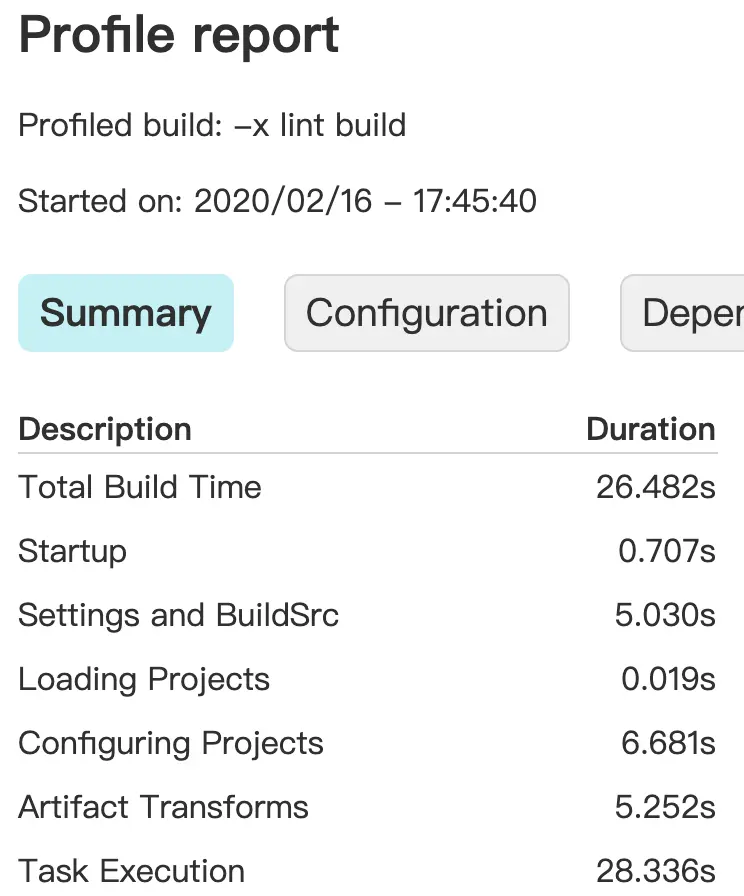 可以看到将lint任务去掉后,构建时间只用了26秒,这个时间还是可以接受的。