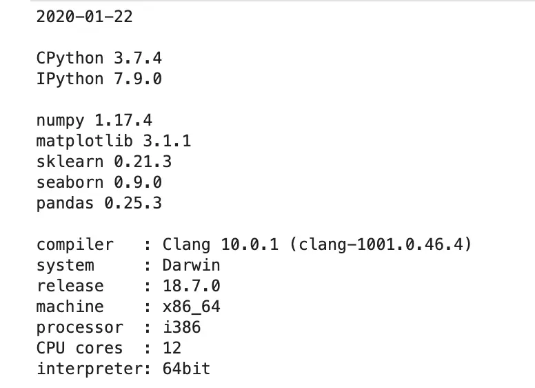 你可以通过指定许多标志来选择打印的信息。可用标志的完整列表在文档中列出。但是下面的代码打印了当前日期、我使用的python和IPython的版本、我安装和导入的库的版本以及关于我使用的硬件的信息。输出如下面的代码所示。
