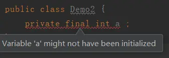 被final修饰的基本类型变量被称为常量,常量必须初始化,初始化之后就不能改变它的值。下面截图中的错误提示说明变量a没有进行初始化。