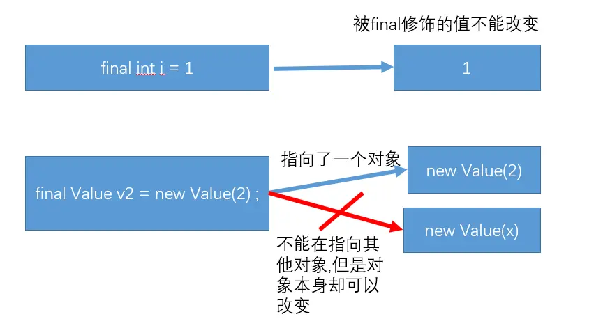 类Demo2有一个常量v1,初始化为了9和v2引用,指向了Value对象。把代码里面的第一行注释去掉,会报不能改变v1的值,说明了常量一旦初始化是不允许改变的。同样,把代码里面的第二行注释去掉,会报不能改变v2的值,同样说明了被final修饰的引用是不能指向另一个对象。但是代码 demo2.v2.i++ 却不会有问题,可以改变指向的对象的值。
