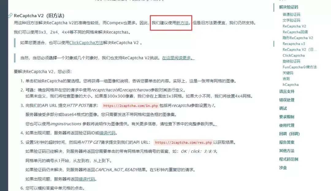 7、Look,人家也说了,旧方法解决ReCaptcha准确率比较低,建议使用新方法,那我们就点击新方法去看看。
