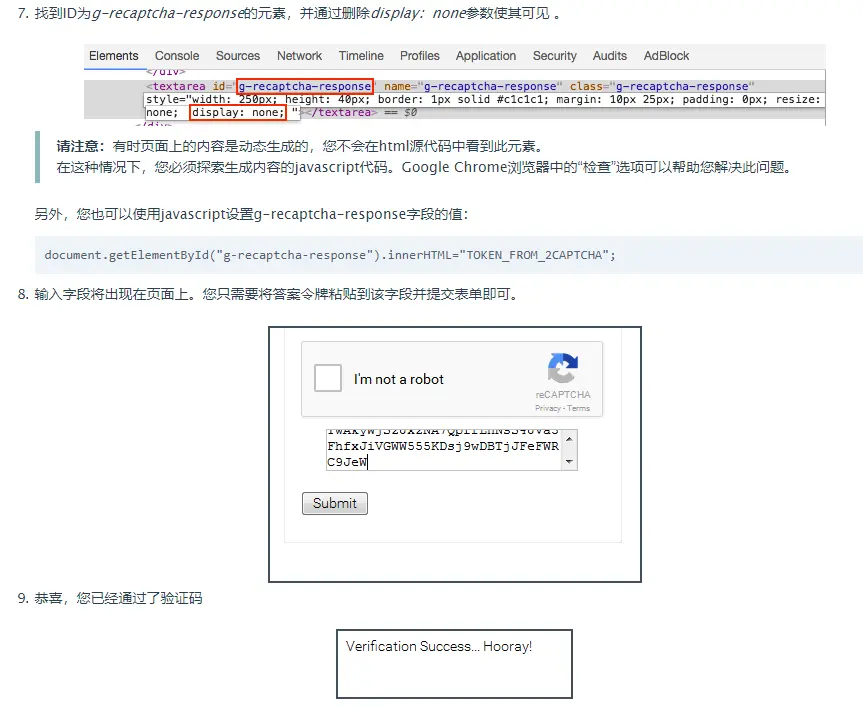 9、人家说,我们先找到data-sitekey参数,然后将data-sitekey参数提交到https://2captcha.com/in.php,等个15-20s再向https://2captcha.com/res.php获取结果。然后找到id=g-recaptcha-response的textarea标签,将display:none这个css删除,将给我们字符串添加到textarea输入框点击提交,就完成了。