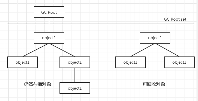 这个算法的思想就是,通过一系列被称为“GC Roots”的对象作为起点,然后向下搜索,所走过的路径被称为引用链。当一个对象到 GC Roots之间没有任何引用链时(即从GC Roots到该对象不可达),则证明该对象是不可用的。