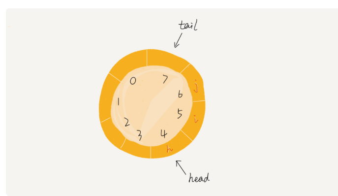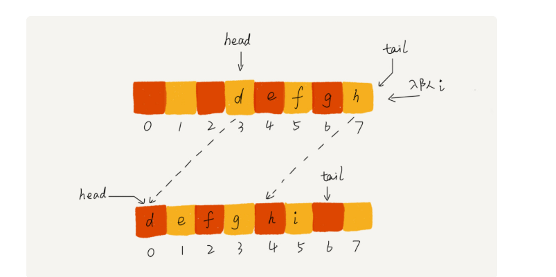 和栈只需要一个栈顶指针不同,但是队列需要两个指针:一个是 head 指针,指向队头;一个是 tail 指针,指向队尾。