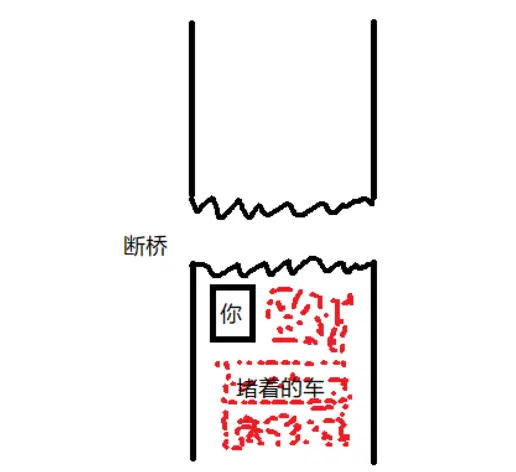 而同样的,当你在开车,开到了桥上,突然桥断了,前面是断桥,后面是一堆车堵得水泄不通。