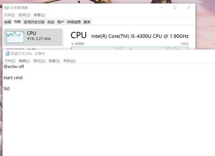 这里超大陆也给大家提供了一串CMD代码,创建一个txt文本,将这串东西复制进去保存,并将txt后缀更改为bat运行,你就可以体验到死循环给你带来的快感了(建议虚拟机试验)。