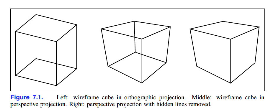 对于视图变换本身来说,其将三维空间的点投射到图像平面的能力仅仅在线框(wireframe)渲染上表现较好。线框渲染仅显示物体对象的线框,同时距离人眼视角较近的表面不会遮盖住较远的表面。如下图:左图为正交视图的线框渲染,中间图为透视视图的线框渲染,右图为遮挡了线条的透视视图。