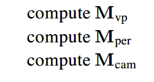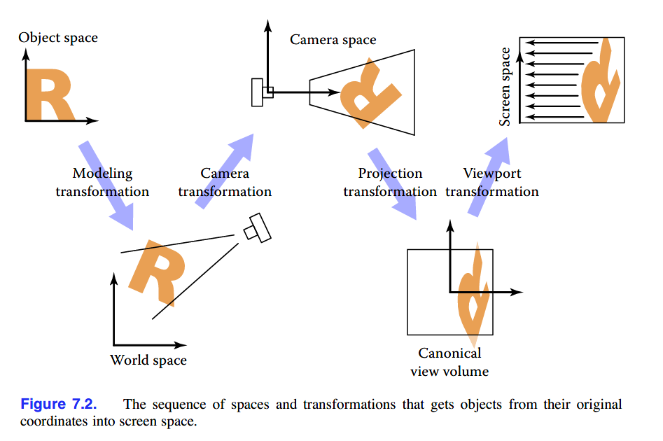 camera transformation将canonical coordinates(或称为world space)中的点转移至相机坐标系(camera coordinates),也可以说是将点置入相机空间(camera space);projection transformation将相机空间中的点移至规范视域体(canonical view volume,之后用CVV简称);最后,viewport transformation匹配cvv至屏幕空间(screen space)。