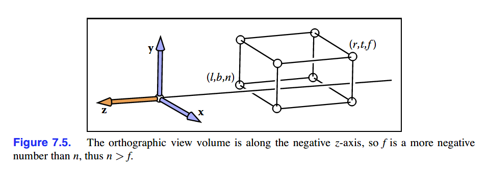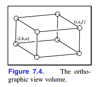 正交投影中,view volume也是一个轴对齐盒子(axis-aligned box),其坐标系为[l, r] * [b, t] * [f, n],这个view volume被称为orthographic view volume: