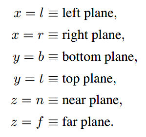 现在还有一个问题是如何决定透视中的l, r, b, t。由于在z=n的平面上,l, r, b, t并未发生改变,可以以在z=n平面上指定l, r, b, t的值。