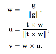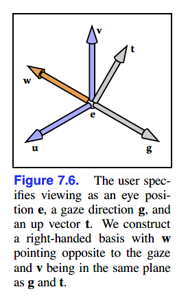 根据g与t,我们可以创建一个原点为e、uvw为基向量的坐标系