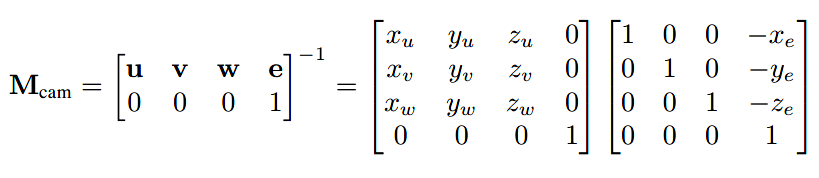 物体对象点的位置是用世界坐标系原点o与xyz为基向量表示的,接下来我们把所有点的位置从xyz坐标系转移至uvw坐标系,就完成了到camera space的转换。在本书第六章中也学习到了坐标系的转换,代入公式即可,因此相机变换的矩阵为: