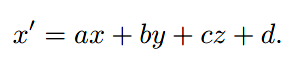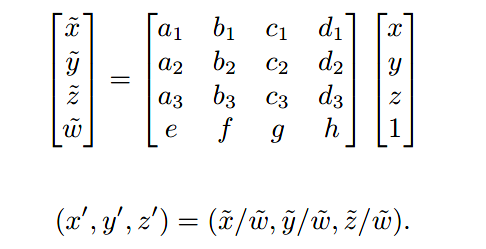 我们可以做一个分离,利用齐次坐标,使用[x y z w]代表(x/w, y/w, z/w)。