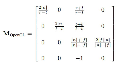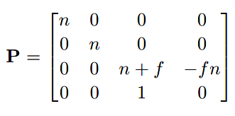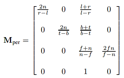 如下公式,我们即能获得透视投影矩阵(perspective projection matrix):