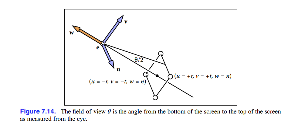 之前一直使用(l, r, b, t)和n来定义窗口,但是我们可以进一步获得一个更加简单的系统,这个系统中相机朝向窗口的中心,这意味着增加了l=-r,b=-t的约束。