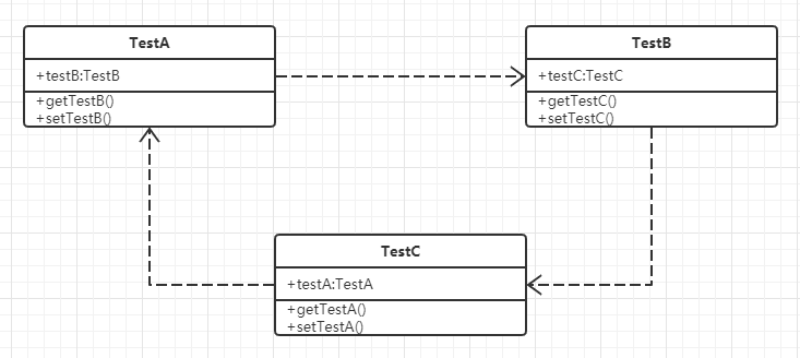 Spring容器创建TestC,根据无参构造器创建bean TestC,并暴露一个ObjectFactory用于提前暴露一个创建中的bean,并将“testB”标识符记录到“正在创建bean池”中,然后进行setter注入"testA"。进行注入"testA"时由于步骤(1)中已经提前暴露一个简单bean,所以可以根据其ObjectFactory获取到创建中的“testA”。 最终完成三个Bean的创建。