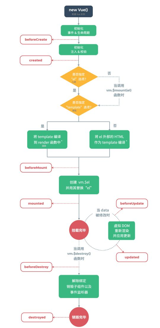 在这一步,实例已完成以下的配置:数据观测 (data observer),属性和方法的运算,watch/event 事件回调。