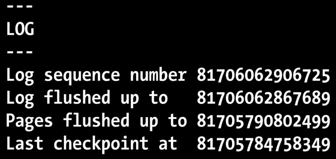 最新写入日志文件的那个 MTR 产生的 LSN 值(图 11.7 中所示的 Log flushed up to),其实就是图 11.7 中所示的 Log 状态的第二行,也就是日志最新写入文件的 LSN 值,这个值的意义很重大,表示的是,到这个 LSN 为止,所有的修改都是完整的了,如果此时数据库挂了,写到这个位置的数据都是可以恢复的,而不需要去关心 Buffer 页面是不是被刷到磁盘。但此时在日志缓冲区中的日志所对应的操作就丢失了,这里是否会丢失事务数据与参数 innodb_flush_log _at_trx_ commit 有关系,如果将参数 innodb_flush_log_at _trx_commit 设置为 1,当前事务的提交肯定会将日志缓冲区中的日志刷到日志文件中;如果设置为 2,那么日志只是写入了操作系统缓存,并没有写入磁盘,那么此时有可能丢失部分已经提交的事务,丢失多少由操作系统决定,这种情况下,即使数据库挂了,只要机器不挂,就问题不大,因为操作系统还会将它对应的缓存写入磁盘;但如果设置为 0 的话,就无能为力了,因为 InnoDB 只负责将事务对应的日志写入到日志缓冲区中,无论是操作系统,还是数据库,都不能保证日志的安全性,所以最好不要设置成这样。