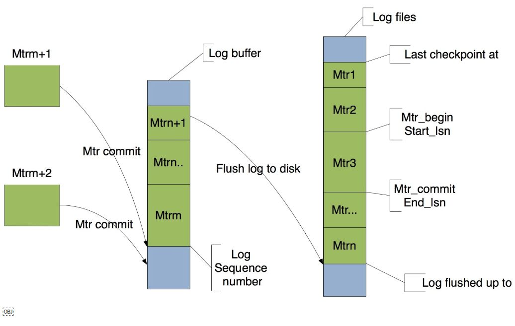 而日志缓冲区也是有大小的,当多个 MTR 提交时,缓冲区被占满了,那么此时系统会将日志缓冲区的日志刷到日志文件中(这里涉及的另一个问题就是日志刷盘时机,这里只是一种情况,其他的后面做专门介绍),为其他新的 MTR 释放空间。此时,日志的流向就是从中间的日志缓冲区向右边的日志文件转移,上面已经提到过,转移其实是平移,在缓冲区是什么内容,写入文件也是什么内容,也是完全连续的,且在日志文件中,还是一个个的 MTR 连续存储。