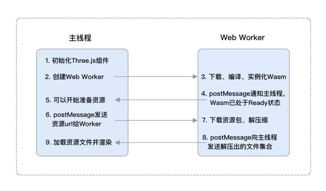 在我们的使用场景里,主线程会首先初始化一些Three.js的组件,比如Scene、Camera、Renderer等,之后才可以加载模型和素材资源,而压缩包的解压必须要在Wasm加载和初始化之后才能进行,解压出资源后才能提供给Three.js去处理,由此可见,主线程和Worker线程之间的交互时序非常重要。具体交互时序如下图所示: