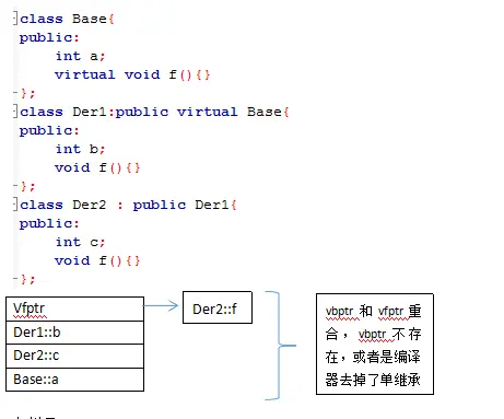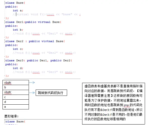 20:单继承,多继承,菱形继承,虚继承时,对象内存中的差异区别?如果存在虚函数呢?