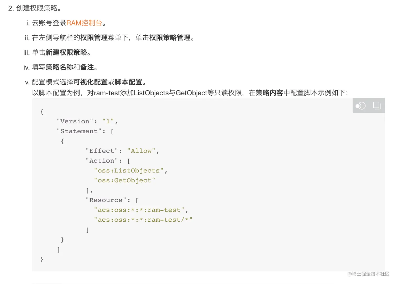权限: 对于用户或者角色,他可以进行什么操作。对于oss来说就是上传文件,删除文件,读取文件这些,oss有专门的命名类似这样:oss:PutObject(这就代表的是上传文件的权限) 如果你想看具体有哪些权限,或者怎么配置可以参考 :基于RAM Policy的权限控制的链接