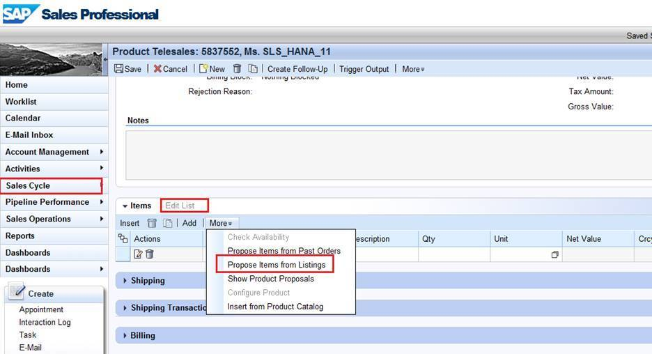Logon on HN1/Q2U using SALESPRO role, Sales Cycle -> Sales Order Search -> Edit List in Items AB -> More -> Propose Items from Listings (please see CRM_PT_SALES_Product_Proposal.xls for detail steps)