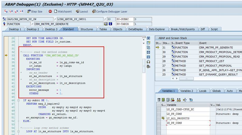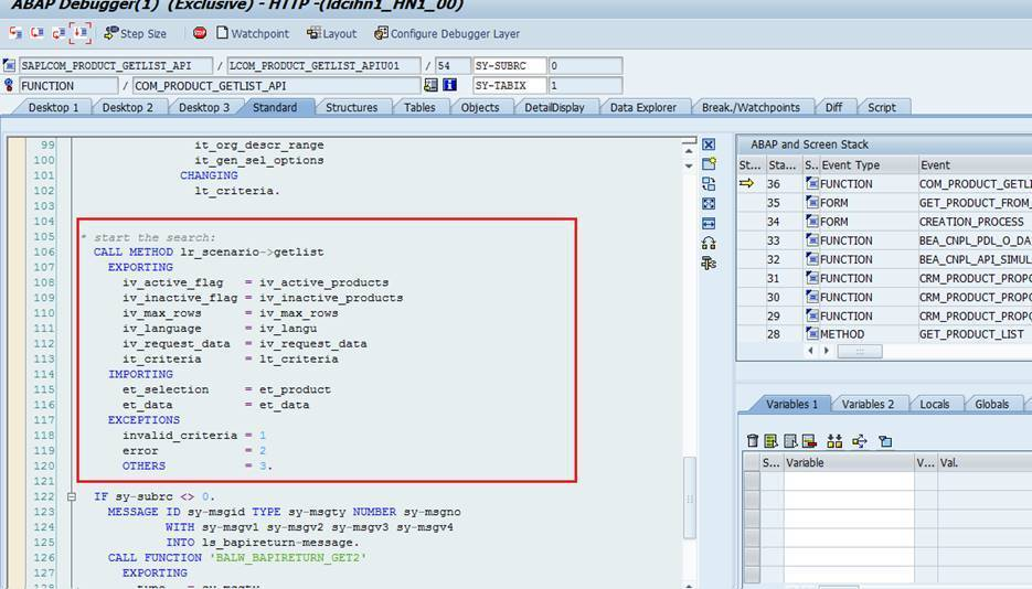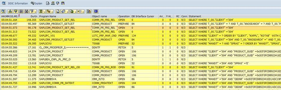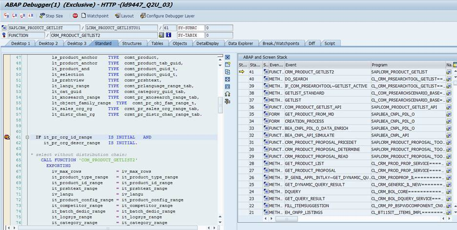 The highlight item is sql in SQL_issue.txt. Setting a breakpoint in SAPLCRM_PRODUCT_GETLIST/CRM_PRODUCT_GETLIST2 to debug, see call stack screenshot: