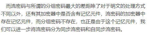 看完分组密码的解释,你就能明白流密码和分组密码的加密器中是否含有记忆元件的解释了:对于分组密码,它处理完一个分组就结束一次加密进程,因此不需要通过内部状态来记录加密的进度;相反的是,对于流密码来说,它是对一个数据流进行连续的加密处理,因此需要加密其中的记忆元件来记录加密器内部的状态。