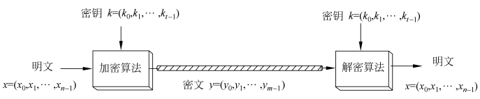 分组密码,就是将明文消息编码表示后的数字序列 x0 , x1 , …, xi , …,将其划分成长为 n 的组 x = ( x0 , x1 , …, xn - 1 ),各一个长度为 n 的分组都分别在密钥 k = ( k0 , k1 , …, kt - 1 ) 控制下,变换成长度为m的等长的输出数字序列 y = ( y0 , y1 , …, ym - 1 ),其加密函数 E: Vn× K→ Vm,Vn和Vm分别是 n 维和 m 维矢量空间,K为密钥空间。