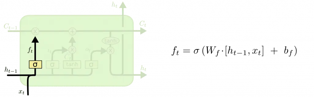 上文所说的三个门指的是忘记门,输入门和输出门。另外还有一个关键点是细胞状态(cell state),贯穿始终,并且连接三个门结构。其中忘记门如下图所示: