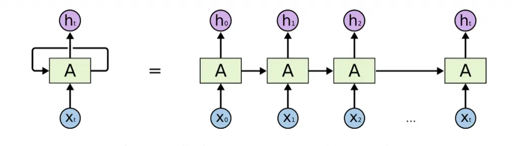 对于循环神经网络,一个非常重要的概念就是时刻,会针对每一时刻的输入结合当前时刻的状态形成一个输出,并且更新当前状态,如下左图所视,循环神经网络的主体 A 的输入除了来自输入层 X t ,还有一个循环的边来提供当前时刻的状态,并输出一个值 h t 。同时 A 的状态会从当前步传递到下一步。理论上,循环神经网络可以看做同一个神经网络结构的无限复制,出于优化考虑,现实中会将循环体展开得到下图右边的部分。