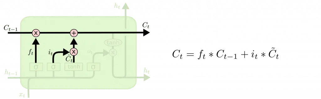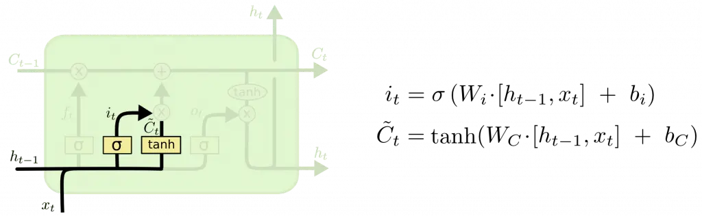 输入门决定给细胞状态添加多少信息,分为两个步骤,首先通过 h__t-1 和 X__t 经过 sigmoid 层得到的值决定更新哪些信息,然后通过 h__t-1 和 X__t 经过 tanh 层得到候选的细胞状态,最后上个步骤的值作用于候选细胞状态得到输入门的输出值。然后这个值会添加进原细胞状态中,更新为新的细胞状态 C__t ,如下所示: