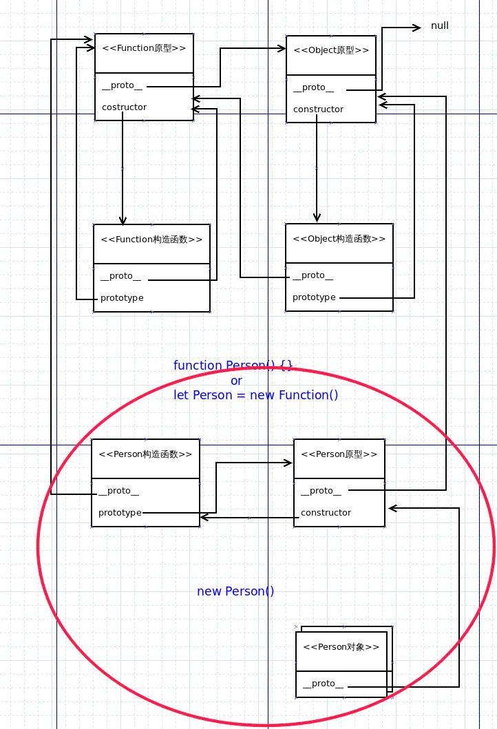 function在创建后都有一个原型对象,可以通过例如Person.prototype找到他,new Person()实际上就是先在该原型下建了一个空对象,将Person方法的this指向该空对象后执行方法