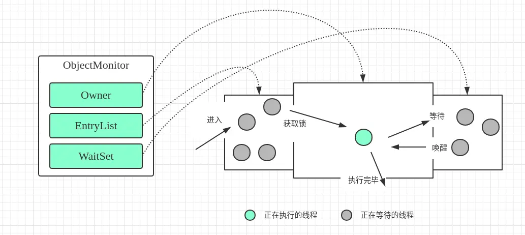 其中Monitor对象和线程获取锁、堵塞、等待、唤醒相关的字段有owner、entryList、waitset。