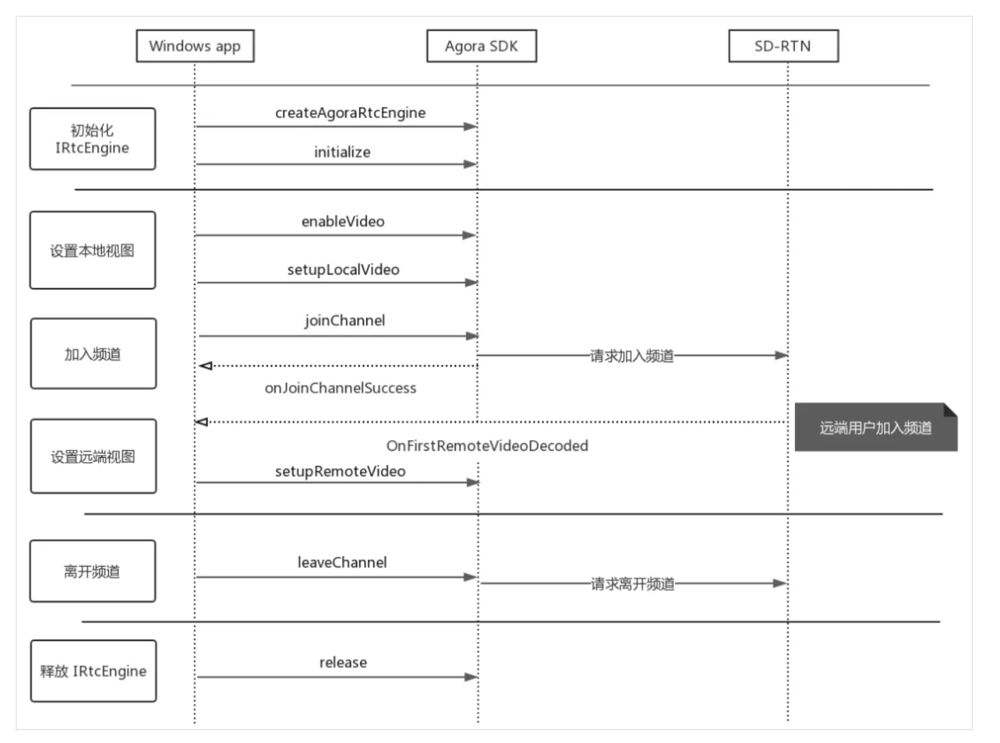 接下来实现音视频通话。视频通话的 API 调用时序见下图: