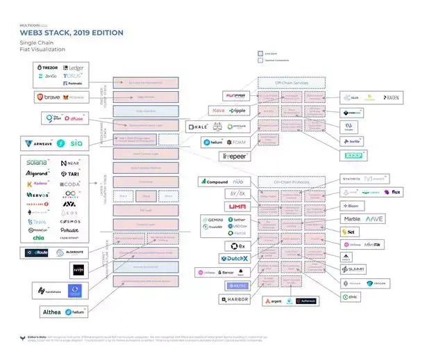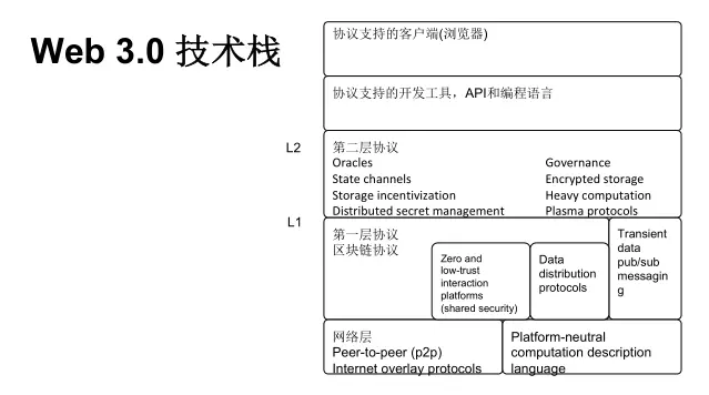再具体到一些细节如Web3.0技术栈,简单的可以划分为这几层,最上层是客户端,比如去中心化的浏览器。在这之下包含了一些协议支持的开发工具,对应API和特定编程语言。脸书的Libra有自己的编程语言Move,以太坊也有自己的编程语言Solidity。再下一层是Layer2的协议,比如说Governance、State channels等。一个区块链应用不能随意获取互联网上的信息,比如说想看天气预报,区块链不能直接提供这样的数据,这里我们就需要Layer2协议栈中预言机协议,通过协议本身预言机机制获取互联网上的信息放在区块链上。Layer1协议,就是广为人知的区块链底层协议,比特币、以太坊等各种各样的公链,联盟链都采用了类似的底层协议,它提供了支撑整个Web3.0愿景的基础。再往下是网络层,如P2P网络传输。