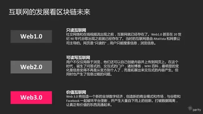 本文为万向区块链蜂巢学院第十三期,Parity亚洲区技术总监、区块链和信息安全技术专家贾瑶琪博士的演讲内容(整理自现场速记)。贾博士在演讲中介绍了Web3.0的定义和应用,并分享了实现Web3.0的技术和手段。